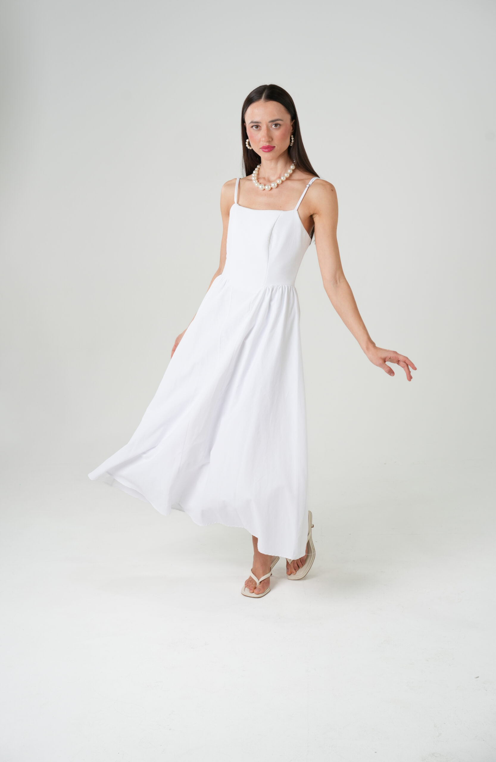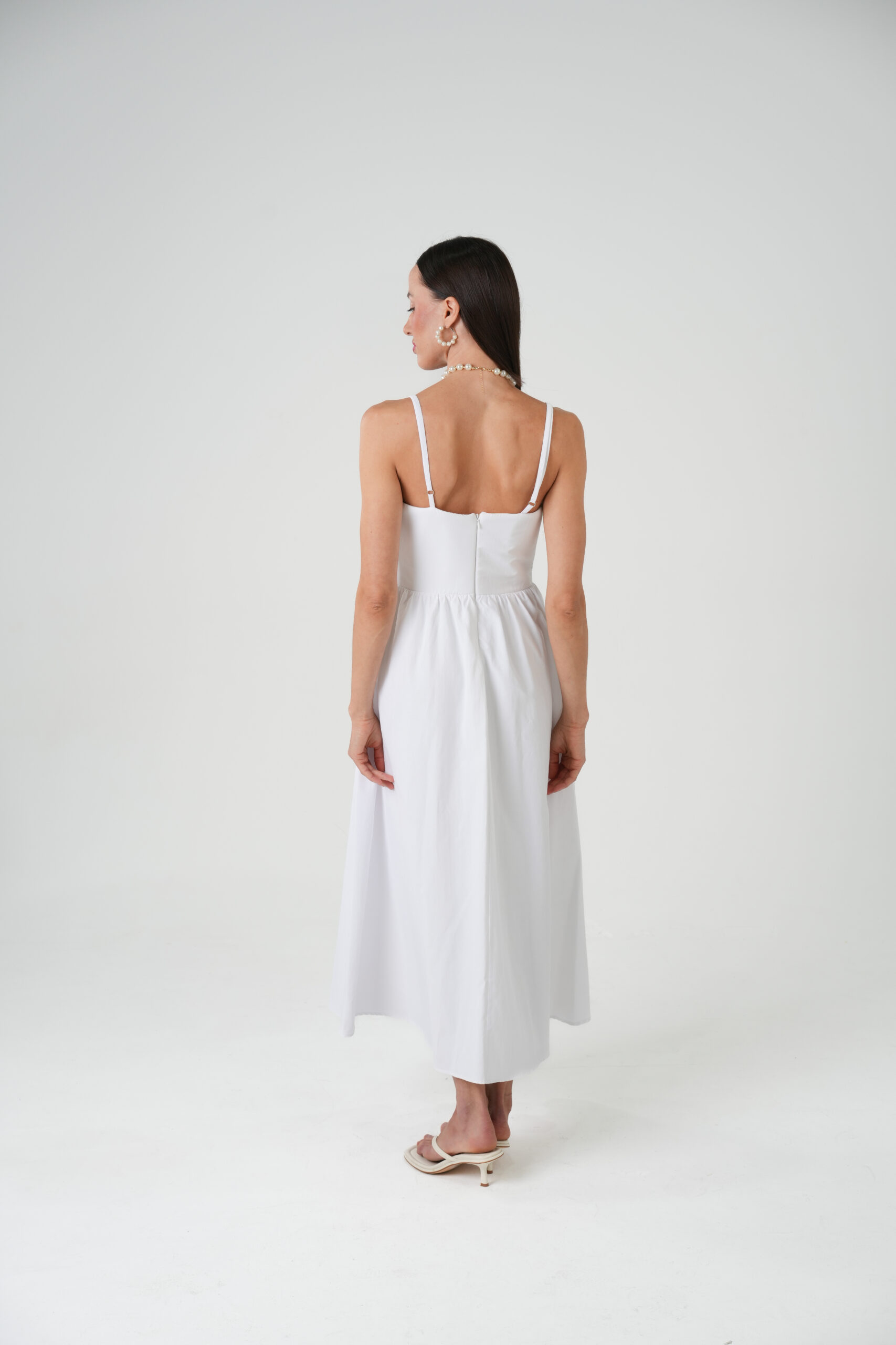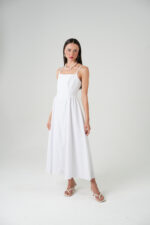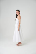 Stunning white midi dress is a wardrobe essential. This piece combines a minimalist aesthetic with a flattering silhouette, featuring delicate straps and a graceful drape. Perfect for creating effortlessly chic looks, day or night.