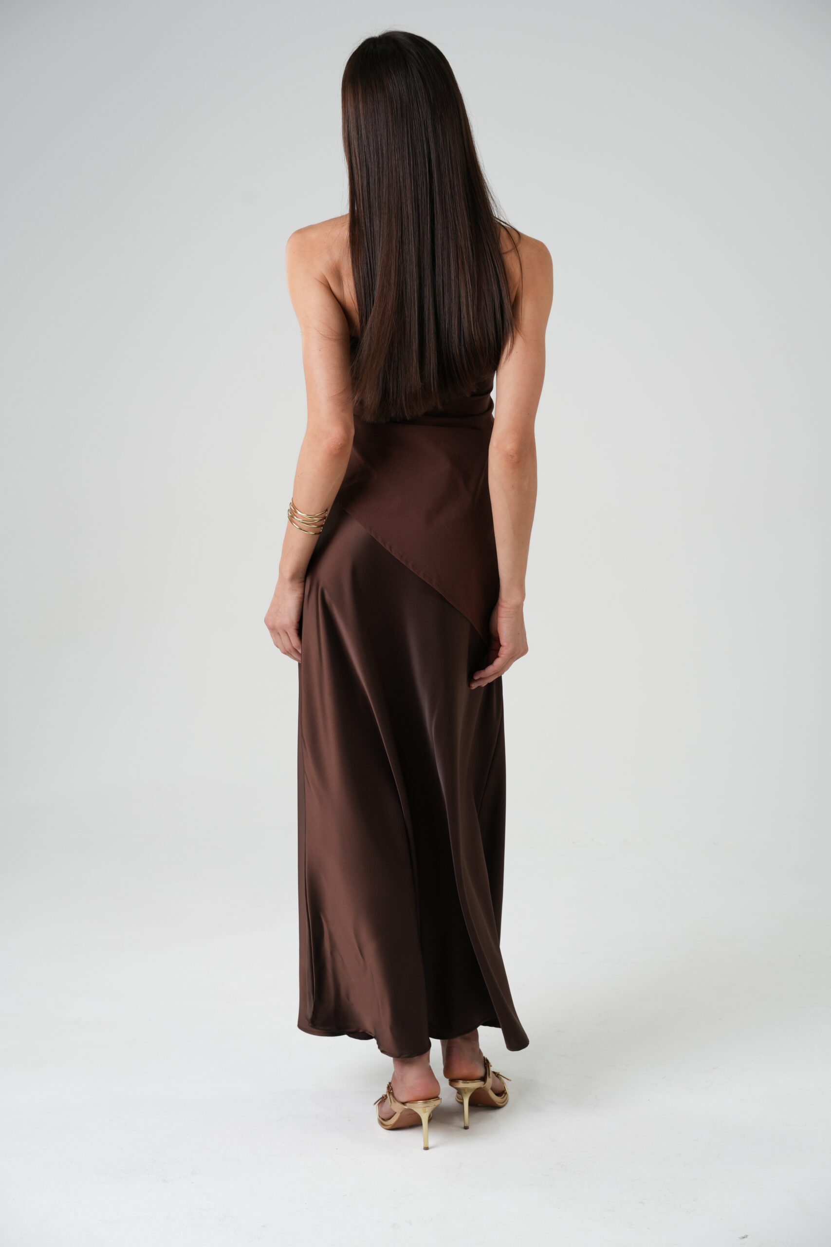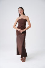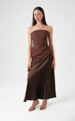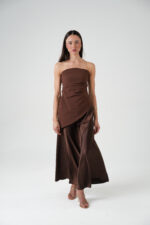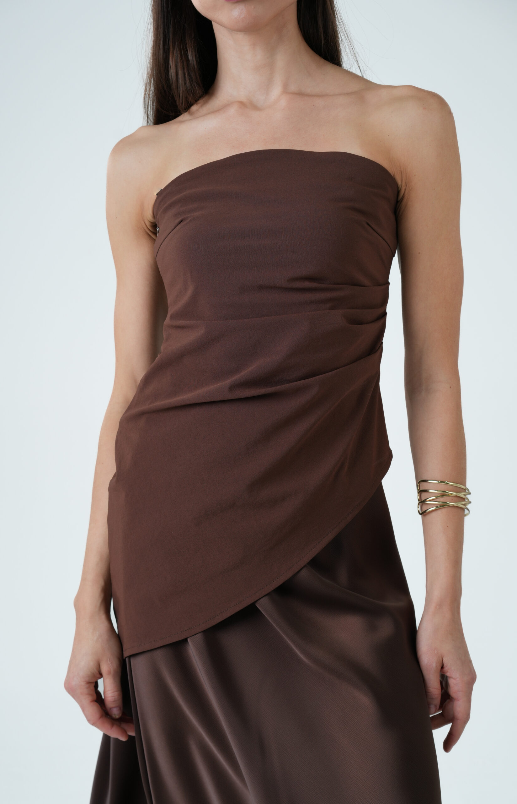 Our chic brown strapless top is a true standout. With its flattering draped detail and rich color, it offers a sophisticated and modern aesthetic perfect for any occasion.